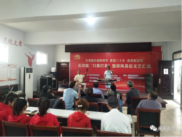 喜迎二十大,奋进新征程。9月30日,为了欢度国庆节和重阳节,瓦坊镇“扫黑除恶”暨移风易俗文艺汇演拉开了序幕,引来了百余名群众观看,部分县镇人大代表、政协委员也参与其中。演出中琴书、大鼓、表演唱等十几个节目轮番上阵,尤其《疫情防控政策好》《劝人敬老》《夸夸新农村》《扫黄打非好处多》等节目更是对当前开展的“扫黄打非”及移风易俗工作起到了非常积极有效地宣传推进作用。