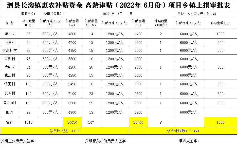 长沟镇2022年6月高龄津贴发放汇总表