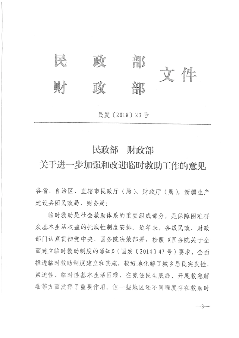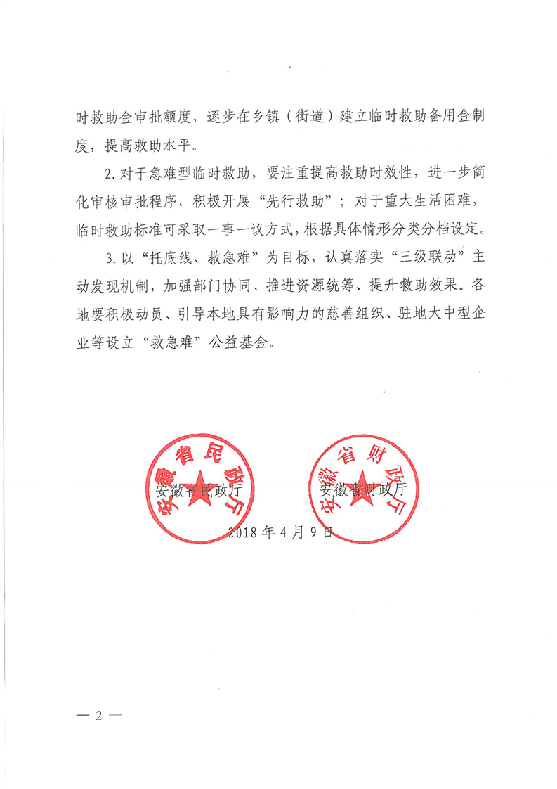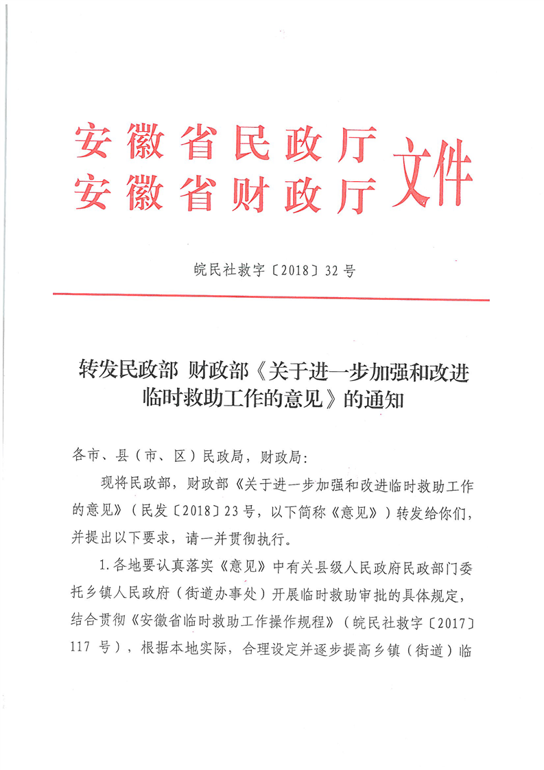 安徽省民政厅财政厅转发民政部财政部《关于进一步加强和改进临时救助工作的意见》的通知(皖民社救字〔2018〕32号)