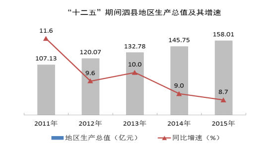 初步核算,2015年全县地区生产总值(GDP)158.01亿元,按可比价格计算比上年增长8.7%。分产业看,第一产业增加值50.93亿元,增长4.9%;第二产业增加值55.85亿元,增长9.5%;第三产业增加值51.23亿元,增长11.7%。三次产业比例由上年的33.4∶35.5∶31.1调整为32.2∶35.4∶32.4,产业结构得到进一步优化。人均地区生产总值19107元,比上年增加1131元。